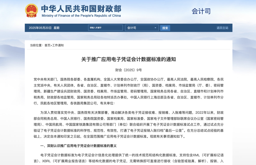 5月19日,财政部会同税务总局等九部门(单位)联合印发了《关于推广应用电子凭证会计数据标准的通知》,决定在全国范围推广应用电子凭证会计数据标准! ▲ 5月19日财政部会同九部门(单位)发布 《关于推广应用电子凭证会计数据标准的通知》 国家鼓励企业推进电子会计档案模式已八年有余,越来越多先进企业积极投入电子会计档案的实施建设中。电子会计档案系统俨然成为未来企业财务数字化建设的必选项,企业全面无纸化流程、自动化电子会计档案归档将进入快速上升期! 尤其是为深入贯彻党的二十大关于“加快建设数字中国,加快发展数字经济”、“推动经济社会发展绿色化、低碳化”的有关精神,自2022年以来,财政部等九部门(单位)联合组织开展了电子凭证会计数据标准试点工作。 按照“成熟一个、推进一个”的原则,相关主管部门有序推进使用频次高、报销入账需求高的电子凭证种类应用电子凭证会计数据标准,持续健全完善电子凭证会计数据标准应用指南。随着电子凭证会计数据标准应用工作不断深入,其政策要求也在不断更新完善。 通过试点充分验证了电子凭证会计数据标准的科学性、规范性、有效性,能够打通电子凭证报销入账归档“最后一公里”: 推广应用电子凭证会计数据标准,有利于顺应数字经济发展,充分发挥会计数据的基础资源和创新引擎作用,切实促进单位会计职能拓展和数字化转型 有利于降低各领域报销纸张打印需求、交易成本及保管成本,有效减少碳排放量,提升新质生产力的全要素组合水平,推动绿色低碳发展,有效节约社会整体资源 有利于增强会计信息的真实性和可靠性,实现对各类经济活动高效监管,从源头上防范财务造假,维护经济社会秩序 有利于解决各类电子凭证标准不统一等重点难点问题,真正实现“让数据多跑路,让群众少跑腿”,满足基层单位需求、提升群众获得感 随着此次电子凭证会计数据标准正式在全国范围内进行推广应用,电子会计档案系统也成为了企业重点关注的对象。 那么到底如何建设一套符合国家标准的 电子会计档案系统呢? 电子会计档案能够给企业带来哪些收益? 作为早一批实践电子会计档案方案的厂商之一,汉得已成功帮助多家企业率先实现电子会计归档模式,完成电子凭证会计数据标准试点工作,并成功通过了国家四部委的验收。 去年,汉得先后帮助两家央企——国内某知名航空公司和某大型物流集团完成了电子会计档案系统的建设,系统完全符合财政部的数据接入规范。 ▲ 点击了解实践案例 近期,汉得又帮助该大型物流集团进行了新一轮系统升级工作,支持“国库集中支付电子凭证”的归档需求,实现对电子会计凭证处理流程的积极响应。 ▲ 5月19日财政部会同九部门(单位)发布的《电子凭证会计数据标准应用指南(推广应用版1.0)》中包含9类常用电子会计凭证 电子会计档案系统 汉得电子会计档案系统作为企业的数字会计档案室,充分理解并快速适配国家政策变化以及电子发票改革趋势,可以帮助企业释放财务归档整理、审计陪同的人力,提高档案的利用价值,推动企业无纸化归档进程,助力企业绿色低碳转型,打通财务信息化的最后一公里! 产品功能全面 作为企业的数字会计档案室,核心功能包括智能电子归档接口、多样化档案采集方式、纸质分类归档流程及便捷的档案利用流程。支持档案在线借阅、在线审计 支持全流程管控 支持电子档案全生命周期管理,具备完整的实物出入库、清册及销毁流程 及时匹配最新的国家政策要求 采用严谨的档案元数据、四性检查、数据加密等管理机制,满足国家四部委对电子档案的认证要求 引入智能化技术 集成影像采集自动化采集工具,内置档案匹配引擎,支持自动建档,引入了3D档案室,支持企业内容资产的数字化管理 汉得作为企业数字化综合服务商,在利用新技术助力企业财务组织支持企业实现发展、管控风险,最终实现可持续的竞争优势等方面不断深入思考、探索和实践。 汉得希望能够助力更多企业实现财务数字化转型,促进数字技术与财务业务场景的深度融合,赋能业务转型升级、高质量发展,为客户持续创新与价值创造保驾护航! 携手汉得,共铸硬核竞争力!