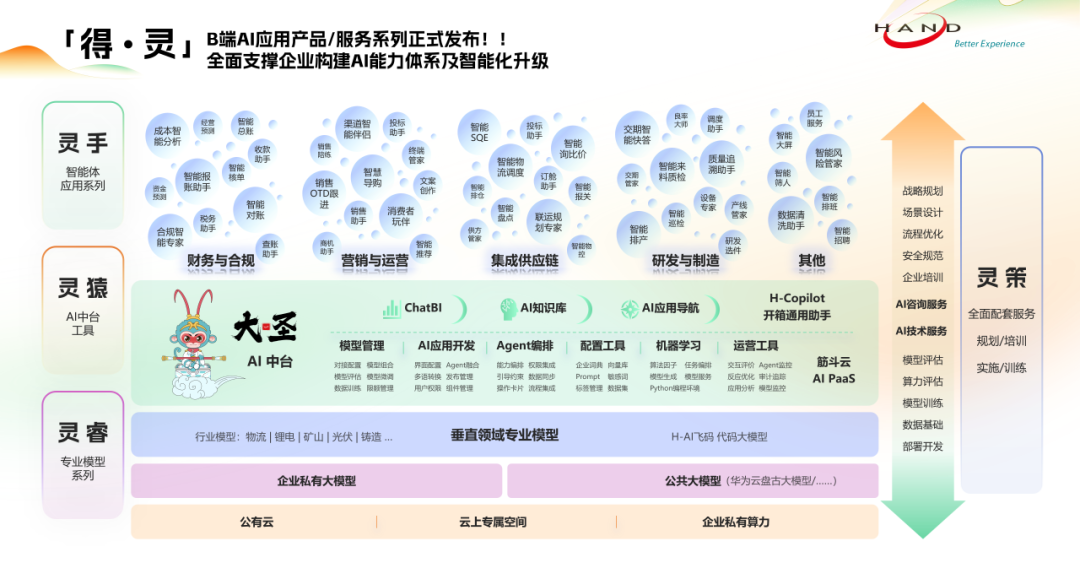 2025年6月20日,华为开发者大会2025(HDC 2025)在东莞隆重召开。汉得作为华为核心合作伙伴受邀出席本次盛会,与现场众多全球开发者、技术专家与行业领袖,共同探索科技前沿,聚力生态创新。 华为坚持以根技术不断创新突破为核心驱动力,同时全面构建多元协同的根技术生态体系,推动技术与产业深度融合。根技术是根生态的构建基石,根生态是根技术价值释放的肥沃土壤。 汉得作为华为云紧密合作的根生态核心伙伴,双方始终保持战略协同,致力于以“技术共融+场景共研”加速驱动AI技术在企业业务中的价值落地,共建AI全流程生态,覆盖企业从战略、场景、解决方案、平台架构、组织及治理等端到端全生命周期,并基于汉得AI中台构建联合解决方案,助力千行万业奔向智能化! 汉得代码大模型 + 智能编码助手 通过华为昇腾应用开发技术认证 会上,华为云新一代昇腾AI云服务全面发布,通过系统级的创新,打破传统AI服务器边界,致力于打造最适合大模型应用的算力服务。目前已为超过1300家客户提供澎湃AI算力,助力千行万业智能化升级。 汉得自主研发的“基于飞码代码大模型的智能编码助手V1.0”也已成功与华为技术有限公司“昇腾AI基础软硬件平台”完成兼容性测试,并通过华为昇腾应用开发技术认证,获得Ascend Native认证证书及认证徽标使用权。 汉得智能编码助手,基于H-AI飞码代码大模型,结合AI智能驱动与汉得H-ZERO专属规则驱动,支持AI代码对话问答、知识问答、智能代码诊断、智能代码补全、高质量汉得H-ZERO相关脚手架代码生成等场景,旨在提供更规范、高效的代码开发辅助,提升用户开发效率与代码质量。 汉得AI中台 x 华为云盘古大模型 加速AI应用场景化落地 本次大会,华为云重磅发布盘古大模型5.5,五大基础模型全面升级,致力于帮助企业构建属于自己的专业大模型。在过去的一年中,盘古大模型持续深耕行业,已在30多个行业、500多个场景中落地,发挥巨大价值。 目前,汉得AI中台全面对接华为云盘古大模型,能够帮助企业实现AI能力快速接入,结合业务快速编排AI助手应用。基于华为云盘古L0层基础大模型和L1层行业大模型,结合企业自有数据,能够在企业各个业务域实现L2层场景化落地,加速AI赋能企业业务。 华为云以昇腾AI云服务、鲲鹏云、鸿蒙应用上云、GaussDB数据库等根技术为基座,拥有全栈可控的产品和领先的技术能力,持续构建枝繁叶茂的根生态,携手伙伴们深入行业解难题,重塑千行万业。 汉得在营销、制造、财务、供应链等核心业务领域积累与沉淀了成百上千个场景解决方案,同时也不断投入与打磨出B端AI应用产品/服务「得·灵」等一系列企业级数字化产品,而且目前在制造域、营销域、财务域、供应链域及其他各个业务领域,已同步推出近百个成熟AI智能体,能够全面支撑企业构建AI能力体系及智能化升级。 未来,汉得与华为云将继续深化合作,协同创新,共同探索AI应用开发新范式,打造安全、可靠、稳定的企业级产品及专业服务,致力于帮助客户更好地拥抱AI,赋能企业AI应用在千行万业加速落地。 携手汉得,共铸硬核竞争力!