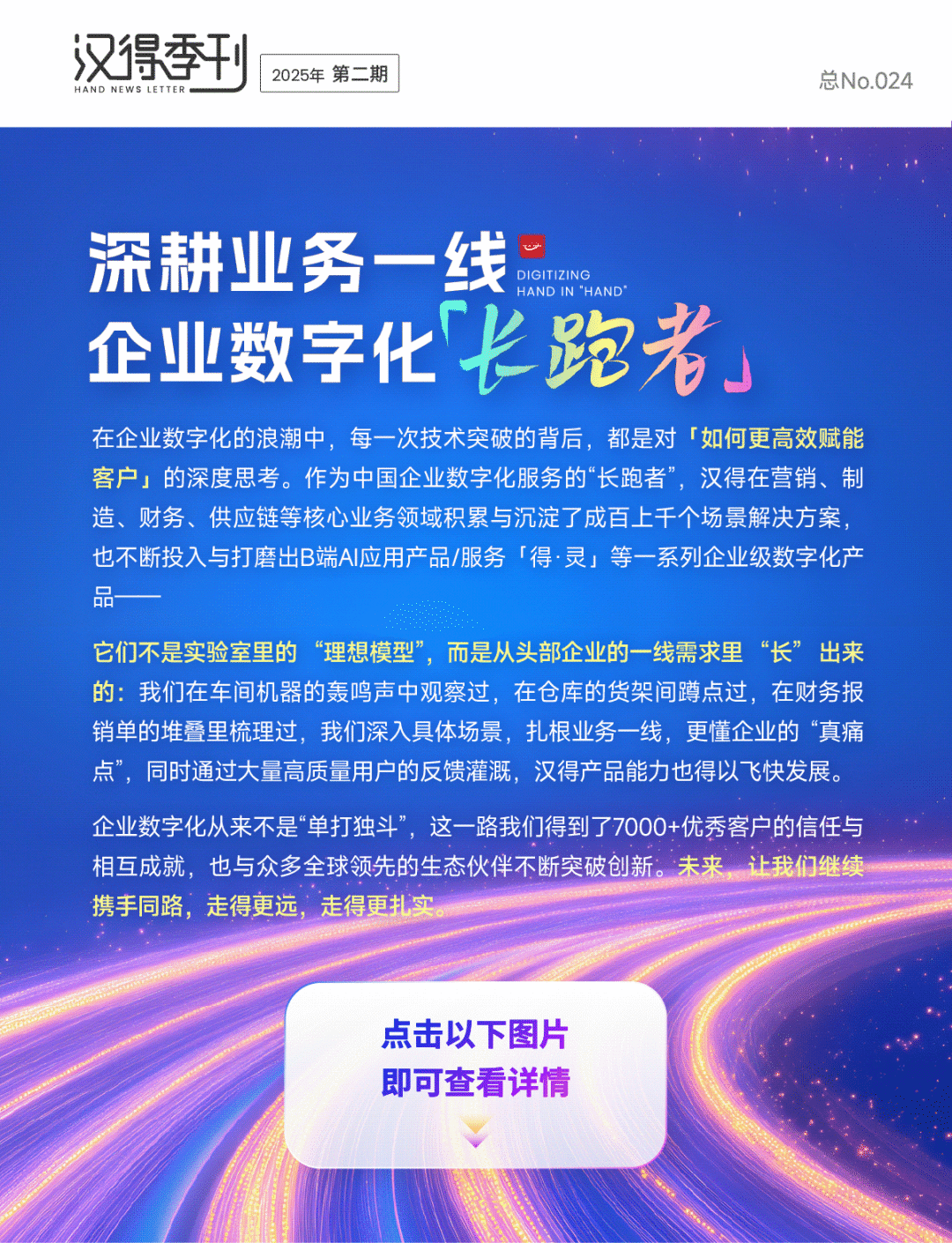 #01携手汉得 · 精选案例合集点击图片,查看详情携手汉得建设因湃智慧工厂,提供通过数据驱动“数字原生”工厂实现极限制造能力标杆案例构建从技术到业务的闭环,推动AI真正扎根制造业场景,携手汉得为万华AI战略筑牢基础基于汉得H-ZERO和供应链计划协同系统上线,三一达成了原本需要数年才能完成的30%开发效率提升汉得助力汇川联合动力实现多系统界面与数据层深度集成,用户可无缝切换多个业务门户,大幅提升跨系统审批和工作效率通过汉得H-ZERO,助力真味生物搭建高效、智能的企业数字化技术平台,加速实现企业数字化建设以汉得H-ZERO为核心,融合H-ONE数据平台、AI中台等产品,打造禾迈股份全球一体化集成供应链平台汉得 x 森马|“这种靠谱对于我们来说非常关键,汉得这家公司创新意识还有技术领先意识也是非常强。”助力实现合并报表的全过程标准化管理,将业财数据深度结合,为圣奥科技提供决策支持与业务洞察基于汉得HiFins智慧财务套件,建设财务费控系统,支撑西交利物浦大学精细化、智能化、数字化运营转型需求助力圣农集团数字化全方位升级,打造问题、需求、故障从提报、分发到处理、反馈、验证全流程闭环的一站式体验携手汉得通过架构升级、平台迁移与解耦重构,帮助大型央企集团广西公司实现统一信息平台自主可控与安全高效运行#02企业级AI智能体应用点击图片,查看详情为B端应用AI而生,为助力企业智能化持续迭代,为客户提供更稳定、更高效的AI应用落地支持通过AI Agent实现智能决策与自动化管理,已成为企业提升运营效率、提升作业质量的关键路径汉得AI中台帮助企业快速构建、运营和持续调优智能体,融入现有业务数字化软件应用专题|AI核心价值在于与业务场景深度融合,汉得已落地多个不同业务领域B端AI应用案例#03夯实企业数字底座点击图片,查看详情“我们已沉淀200多个可复用组件,新系统上线周期缩短一半,平台成了IT真正的‘发动机’!”“用汉得H-ZERO高低代码融合平台后,哪些能拖拽就拖拽,遇到复杂的就补高代码,不再走弯路。”聚焦八个方面进行产品功能升级与优化,为企业提供更全面、稳定、高效的集成解决方案专题|汉得H-ZERO能够通过统一架构整合企业应用,形成可复用的业务组件库,助力业务高效落地,打造硬核竞争力#04让企业数据活起来点击图片,查看详情汉得ChatBl将持续以“智能驱动、价值为本”理念,与客户共探数据新边界,共赴高质量发展新征程懂场景的企业级智能助手,构建深度融入业务的“智能闭环”和企业级落地的可靠性保障专题|助力企业达成全域数据标准化整合与共享化应用,结合AI技术实现数据开发治理分析的智能化进阶#05赋能企业业务增长点击图片,查看详情专题|如何利用数据和AI为企业业务创新服务,实现制造企业“轻实施、重应用”的数字化建设专题|直面企业在构建营销系统时面临的难题,从价值出发,寻找AI应用场景,为行业的发展点亮新方向专题|促进数字技术与业财场景深度融合,帮企业实现降本增效、精准决策,塑造财务核心竞争力专题|汉得通过“单体Agent”与“自主Agent”赋能,持续以技术创新助力企业突破供应链管理瓶颈#06助力企业全球化拓展点击图片,查看详情汉得助力思锐智能构建以SAP系统为核心的IT运营平台底座,增强集团内部协同效率与精细化运营管理能力为HAPPY GLOBAL搭建敏捷智能的B2B商城、业财一体化体系、供应链协同体系,强化平台的竞争优势专题|汉得全球化战略四大支柱:共建全球生态同盟、自主产品国际化、AI驱动创新、全球服务升级#07让企业数字化“落地生根”点击图片,查看详情汉得与华为云携手共建AI全流程生态,覆盖战略、场景、解决方案、平台架构、组织及治理等端到端全生命周期汉得与亚马逊云科技携手打造全栈行业联合解决方案,并基于架构在其平台上的汉得AI中台与H-ZERO构建各类企业级应用 汉得与易立德携手打造兼具国际水准与本土适配性的研发管理解决方案,构建企业自主可控的数字化研发体系