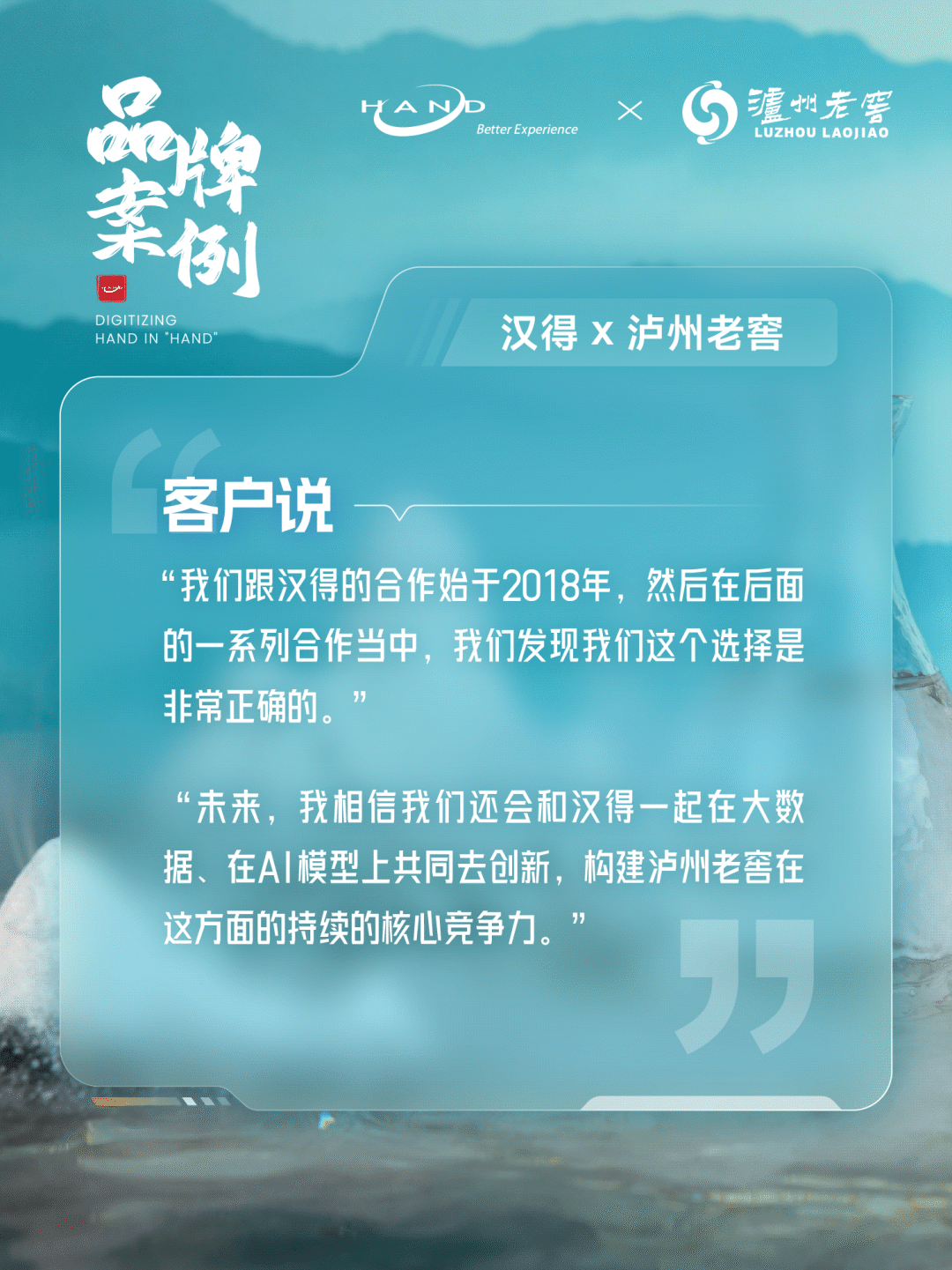 在30年的企业历程中,汉得始终在坚持做一件事:聆听客户的故事,了解他们真正需要什么。 90年代改革开放浪潮愈烈时,汉得通过IT实施服务帮助众多海内外企业重塑管理形态,迎接那个万物生长的激情年代。千禧年之际,汉得以定制化的IT解决方案为众多企业加速经营效率,紧跟油门到底的时代速度。2010年代,转型升级成为中国企业面临的最大课题,汉得数字化力量让众多海内外企业无惧风险,稳中递进。2020年代,新质生产力驱动变革,汉得以深厚的数字化行业积累助力客户重塑核心竞争力,加速突破未来。 时至今日,汉得依然在聆听企业客户的故事,并努力成为故事中帮助主角实现竞争力进化、打造新商业版图的最佳配角。在汉得的伙伴名录中,一段又一段传奇商业故事正不断展开。 品牌案例 汉得 x 泸州老窖 明朝嘉靖年间,酿酒师傅们在泸州城的城东挖掘出了第一口用于酿制当地传统酒的窖池。经历700余年,它已然成为了中国酿酒史上的活化石,也成就了一个中国白酒业家喻户晓的名字——泸州老窖。 进入21世纪,泸州老窖开始构建以数据为核心的营销体系,逐步实现从"市场感知"到"消费者洞察"的转变。 时间来到2015年,泸州老窖意识到现代消费者的需求已经从“购买商品”转向“体验品牌”,保持传统名酒的竞争力,营销数字化将是一堂必修课。 2018年开始,泸州老窖和汉得信息开始构建全域的消费者数字化。2020年后,泸州老窖通过对消费者的触达开始优化渠道、终端网络。 几年间,汉得帮助泸州老窖完成了渠道数字化深耕,实现了终端门店的线上营销数字化。 通过汉得打造的营销数字化平台,泸州老窖得以将团队、渠道、终端、消费者汇聚在同一个网络,实现了从生产到销售的全景洞察与数字化管理。 泸州老窖与汉得共同搭建起了白酒行业第一个千万级消费者的会员平台。从几年前的100多亿到今天的300多亿的营收,数字化基础对于泸州老窖业务的扩张提供了强有力的支撑。 ▲ 苏王辉 泸州老窖股份有限公司首席数字官 “我们跟汉得的合作始于2018年,然后在后面的一系列合作当中,我们发现我们这个选择是非常正确的。 一方面,汉得对于我们白酒行业有着很深度的了解,特别是在销售这个环节。 第二个方面,也就是在这七年的合作当中,其实我们合作的项目总体来说应该是超过10个以上的,那基本上每个项目汉得提供给我们的都是保证了一定的服务质量。 第三个方面,就是在技术层面,从最早的5G到随后的云计算,到现在的大数据AI,那汉得在这个技术上始终保证了一个持续的跟我们共同成长的一个方式,能够给我们在很多的环节提供我们技术上的支持。 未来,我相信我们还会和汉得一起在大数据、在AI模型上共同去创新,构建泸州老窖在这方面的持续的核心竞争力。” 每一次数字化的跃迁,都是汉得与客户并肩前行的故事。这些故事不断地发生、累加、递进,终成为汉得最珍视的财富。 未来,我们将继续倾听每一位客户的故事,用执着不息的专业和沉淀,为每一段核心竞争力的进化,全力以赴。 携手汉得,共铸硬核竞争力!