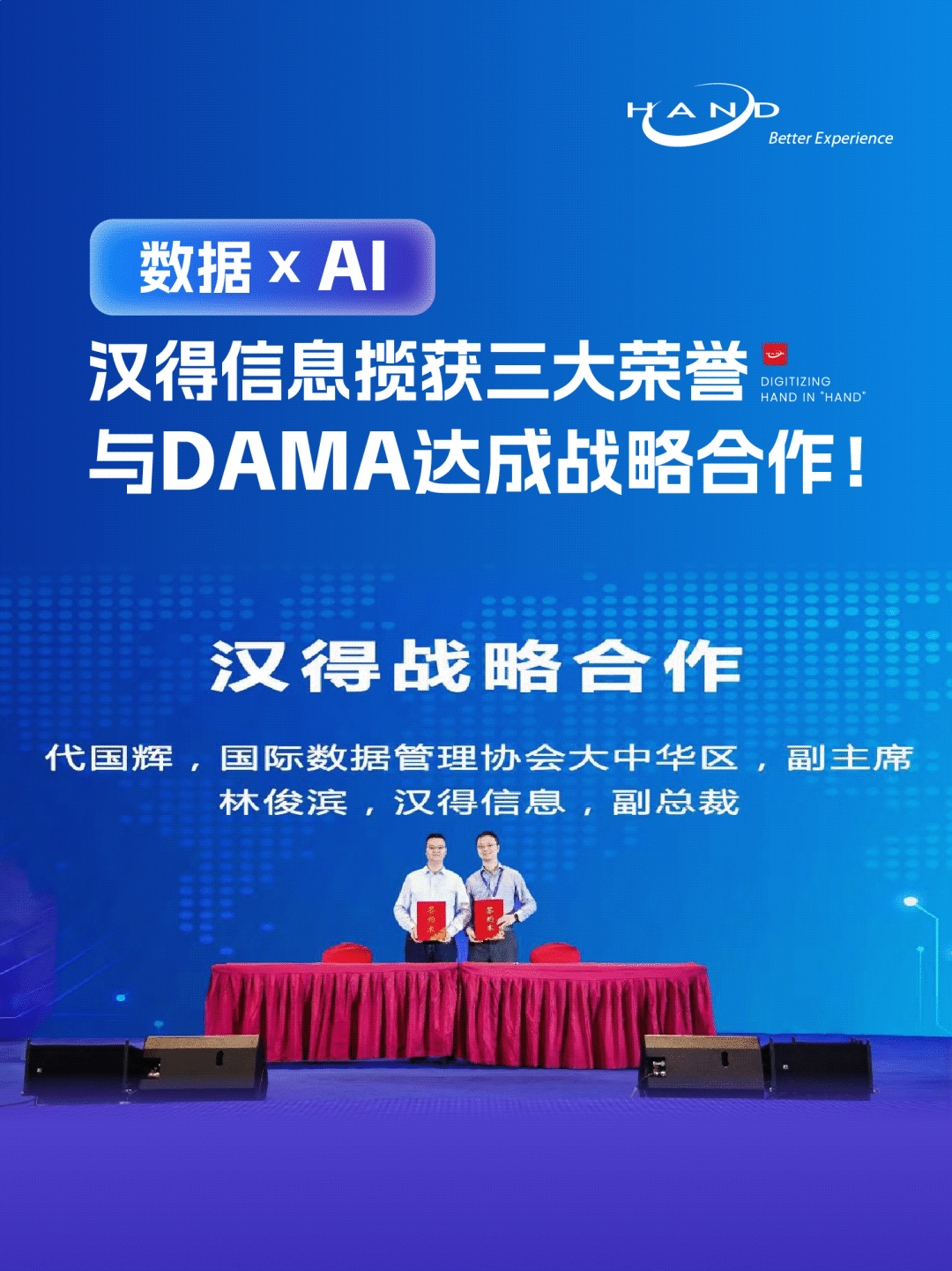 2025年9月26-28日,作为第四届全球数字贸易博览会核心板块的2025全球数据管理峰会在杭州圆满落幕。 这场以“数据 x AI”为核心主题的行业盛会,汇聚全球政产学研领域的顶尖智慧,汉得凭借在数据管理领域的深厚积累与创新实践,现场一举斩获三项重磅荣誉,并与DAMA达成关键战略合作,同时应邀分享前沿实践成果,全方位彰显专业硬核实力! 汉得数据治理实力获高度认可 斩获三项重磅荣誉 数据治理优秀产品奖 汉得H-ONE融合数据平台产品,凭借在数据整合、治理、应用等环节的全流程赋能能力,以及为企业数字化转型提供稳定、高效支撑,获评“数据治理优秀产品奖”。 汉得H-ONE融合数据平台,提供一站式的大数据存储、数据开发、治理、主数据管理、服务管理、资产管理、运营管理,以及ChatBI智能分析能力,提供覆盖咨询-产品-服务的全域数据解决方案,以数据驱动企业管理提效、业务提速与财务增值,助推企业重塑增长驱动力。 数据治理最佳实践奖 汉得主导落地的“海亮集团主数据治理项目”荣膺此项殊荣,作为数智化能力与企业战略深度融合的经典案例,该项目连续2年获评该奖项。 海亮集团作为连续多年上榜世界500强、业务覆盖12个国家和地区的多元化集团,此前曾面临“数据孤岛”、标准不统一、管理权责分散等痛点。 汉得基于其“12345”数字化转型战略,以“两体系一平台”为核心落地路径,历经8个月完成物料、客户等12项核心主数据管理。 项目创新性实现标准-流程-平台-接口“四个统一”,统一集团物料五段码分类模板1500余套,与SAP、CRM等9大系统无缝集成,覆盖浙江基地二十余家公司。 不仅成功解决跨领域数据壁垒,更支撑生产、采购等四大领域业务价值持续提升,为海亮全球业务协同与AI大模型应用夯实数据基础,成为多业态集团主数据治理领域经得起时间检验的典范! 数据治理专家奖 汉得数智事业部总经理曹正炎先生,凭借在数据治理领域的深度洞察、丰富项目经验及对行业标准的积极践行,成功获评“数据治理专家奖”。 汉得数智事业部是H-ONE融合数据平台、HDSP数据开发治理平台、HMDP主数据平台、ChatBI灵悉智能问数平台等多个硬核产品的原厂部门,能为企业提供从咨询规划,到落地交付,再到运维支持的全链路专业服务。 本次获奖,不仅是对曹正炎先生个人在数据治理领域深厚造诣与卓越贡献的高度肯定,更是对汉得专家团队专业能力与行业影响力的权威认证。正是有这样一批顶尖专家的引领,汉得才能为企业客户提供更前沿、更可靠的数据战略咨询。 从产品、实践到专家,充分体现出汉得对数据在治理与应用中的核心价值的认知——构建“数据JIT”(Just In Time),其核心是:在正确的时间,将正确的数据,以正确的形式,传递给正确的人,以支持正确的决策。 让数据成为驱动企业运转的血液,从“成本中心”转变为无可替代的“竞争力引擎”。 共筑全球数据管理生态新蓝图 汉得战略签约DAMA 在本次峰会上,汉得副总裁林俊滨先生与国际数据管理协会(DAMA)副主席代国辉先生作为双方代表,正式签署战略合作协议,标志着汉得在数据管理标准化、国际化合作领域迈出关键一步,也为双方共同推动全球数据管理生态建设奠定坚实基础。 国际数据管理协会(DAMA)是全球数据管理领域最具权威性和影响力的专业组织,其推出的DMBOK(Data Management Body of Knowledge)是DAMA发布的数据管理知识体系指南,被誉为数据领域的“百科全书”。 此次与DAMA大中华区达成战略合作后,汉得将充分整合自身在企业数字化服务领域的实践经验,与DAMA共同开展数据管理知识体系的推广、专业人才的培养、行业标准的落地等工作: ◈ 联合开发符合中国企业需求的数据管理课程与认证体系,助力企业数据人才能力提升 ◈ 共同探索“数据 x AI” 融合场景下的最佳实践,推动数据管理技术在各行业的深度应用 ◈ 携手打造数据管理生态平台,链接全球资源,为中国企业数字化转型提供国际化视野与本地化支持 数据如何成为员工超级助手 前沿实践分享 在本次大会的主题演讲环节,汉得资深专家周阳受邀发表题为《数据如何成为员工超级助手》主题演讲,并一针见血地指出了企业普遍面临的困境:“不是不努力,而是不协同”。 他深刻剖析企业内部运营失衡、外部协同割裂、战略集成缺失三大维度下的九大典型业务场景,如“需求预测难、计划与执行脱节、高缺货高库存并存、订单履约不透明”等,引发与会者的强烈共鸣。 周阳还进一步阐述如何通过“塔·台·室”三层数字化场景设计能力与“天地融合”的数字化底座支撑能力,让“数据JIT”理念落地生根: 塔(看得全) 实现订单、库存、生产、采购等全链路数据的全局可视 台(管得住) 提供从指标监控、异常预警、根因分析到处置建议的闭环管理 室(协同快) 实现跨部门计划分解、任务分工与进度协同 坚实底座 以H-ONE融合数据平台和汉得AI中台为核心,整合从泛ERP实施到智慧供应链、数字营销等丰富应用,为企业修好数据流通的“高速公路” 演讲现场,周阳还展示了实现“数据JIT”后为企业带来的可量化价值,例如:需求预测准确率提升至85%以上、客户准时交付率稳定在95%以上、仓储物流总成本降低10%-15%、新品上市周期缩短30%-50%等,这些实实在在的收益,让“数据成为员工的超级助手”这一愿景变得触手可及。 荣誉,是过去