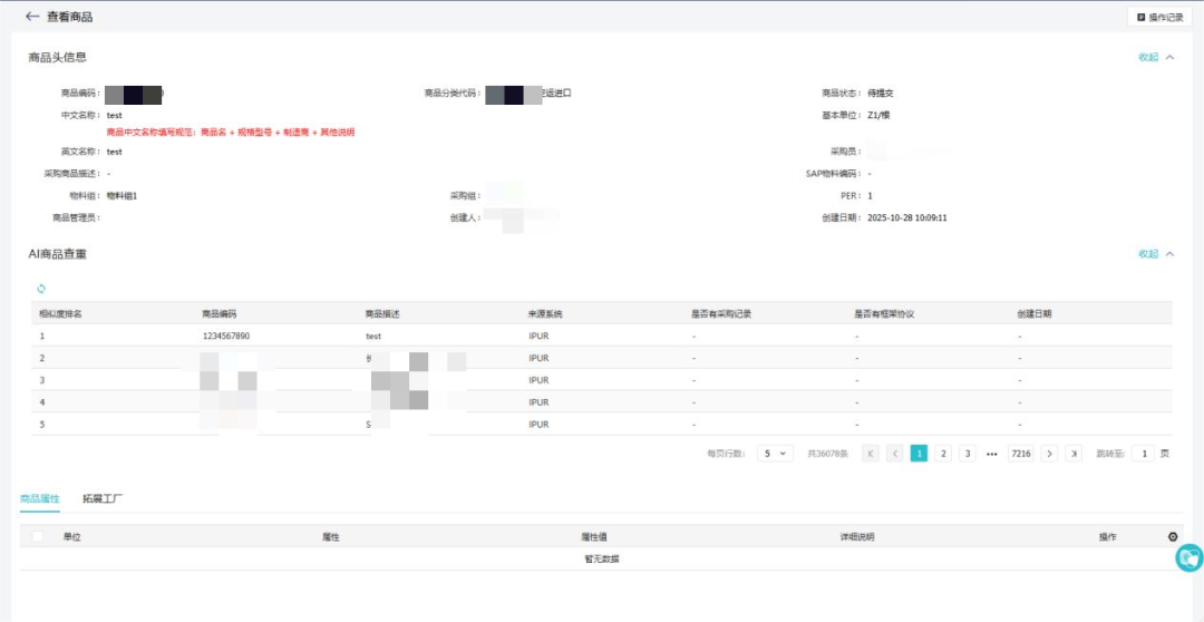 相似商品检索:嵌入新建商品等多环节,自动检索商品数据库,推荐相似商品信息(含来源系统、创建日期、相似度排名等更多参考信息),支持复用
