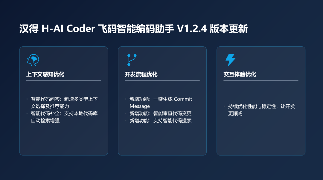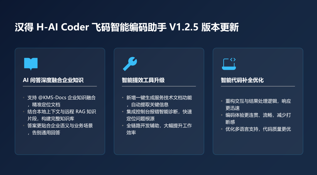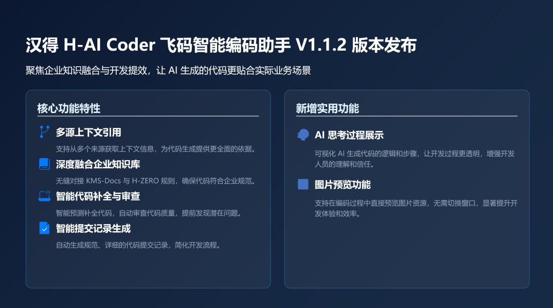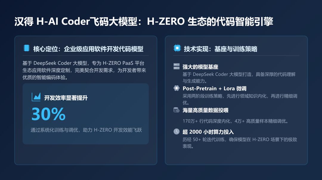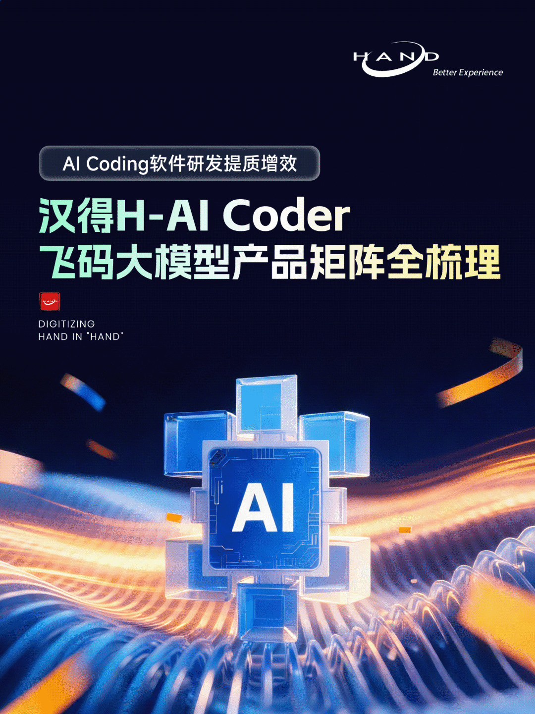 行业内多款模型 AI Coding 能力相继升级迭代,在代码生成、长上下文处理等核心能力上实现突破性进展,更有全新架构升级加持,持续推动 AI Coding 效率迈入新台阶。 汉得 H-AI Coder 飞码大模型追随技术进步持续迭代升级,精准匹配企业级软件开发需求,为企业数字化软件开发注入强劲动力! 开发效率再提升 30% 汉得 H-AI Coder 飞码大模型 汉得 H-AI Coder 飞码大模型,基于 DeepSeek Coder 大模型,采用 Post-Pretrain 和 Lora 微调技术,在 Post-Pretrain 阶段使用超 170 万行代码数据,Lora 微调阶段应用超 4 万个样本,历经 50 多轮训练,总时长超 2000 小时,已实现深度内化,完美契合企业及应用软件开发需求,助力 H-ZERO PaaS 平台生态应用软件开发效率再提升 30% ! 代码质量持续跃升 汉得飞码智能编码助手 汉得 H-AI Coder 飞码智能编码助手持续迭代升级,从 V1.1.2 到 V1.2.6,每一个版本都带来惊喜。 V1.1.2 版本聚焦企业知识融合与开发提效,支持多源上下文引用,深度融合企业知识库(KMS-Docs)与内置 H-ZERO 规则,让 AI 生成的代码更贴合实际业务场景。 同时还提供智能代码补全、智能提交记录生成与智能代码审查功能,同时新增 AI 思考过程展示、图片预览等实用功能,全面提升开发体验。 V1.2.4 版本在上下文感知、开发流程、交互体验上全面优化。 智能代码问答新增多类型上下文选择及推荐能力,智能代码补全支持本地代码库自动检索增强;新增一键生成 Commit Message、智能审查代码变更,支持智能代码搜索;持续优化性能与稳定性,让开发更顺畅。 V1.2.5 版本让 AI 问答深度融合企业知识,支持 @KMS-Docs 企业知识融合,结合本地上下文与远程 RAG 知识片段,答案更贴合企业语义与业务场景。 智能提效工具升级,新增一键生成服务技术文档功能,集成控制台报错智能诊断;智能代码补全优化交互与结果处理逻辑,编码更连贯。 V1.2.6 版本围绕 “编码更流畅、对话更高效、知识更精准” 持续打磨。 智能代码补全支持单次补全结果全量缓存,连续确认更流畅;智能对话体验优化,代码展示清晰,支持一键创建文件、插入 / 替换代码等操作,新增「AI 合并」能力;@KMS-Docs 能力增强,支持手动筛选知识库文档;还新增插件更新自动推送,确保用户及时获取最新功能。 汉得 H-AI Coder 飞码大模型与智能编码助手,结合 AI 智能驱动与 H-ZERO 专属规则驱动,支持智能代码补全、代码对话问答、智能代码诊断等多种场景,还具备企业级权限管控及可视化分析能力。 在 AI Coding 成为行业热点的当下,它们无疑是企业提升开发效率、保障代码质量的不二之选! 想要体验这强大的开发工具吗? 关注汉得 获取更多 关于 H-AI Coder 飞码的最新动态 携手开启智能开发新时代!