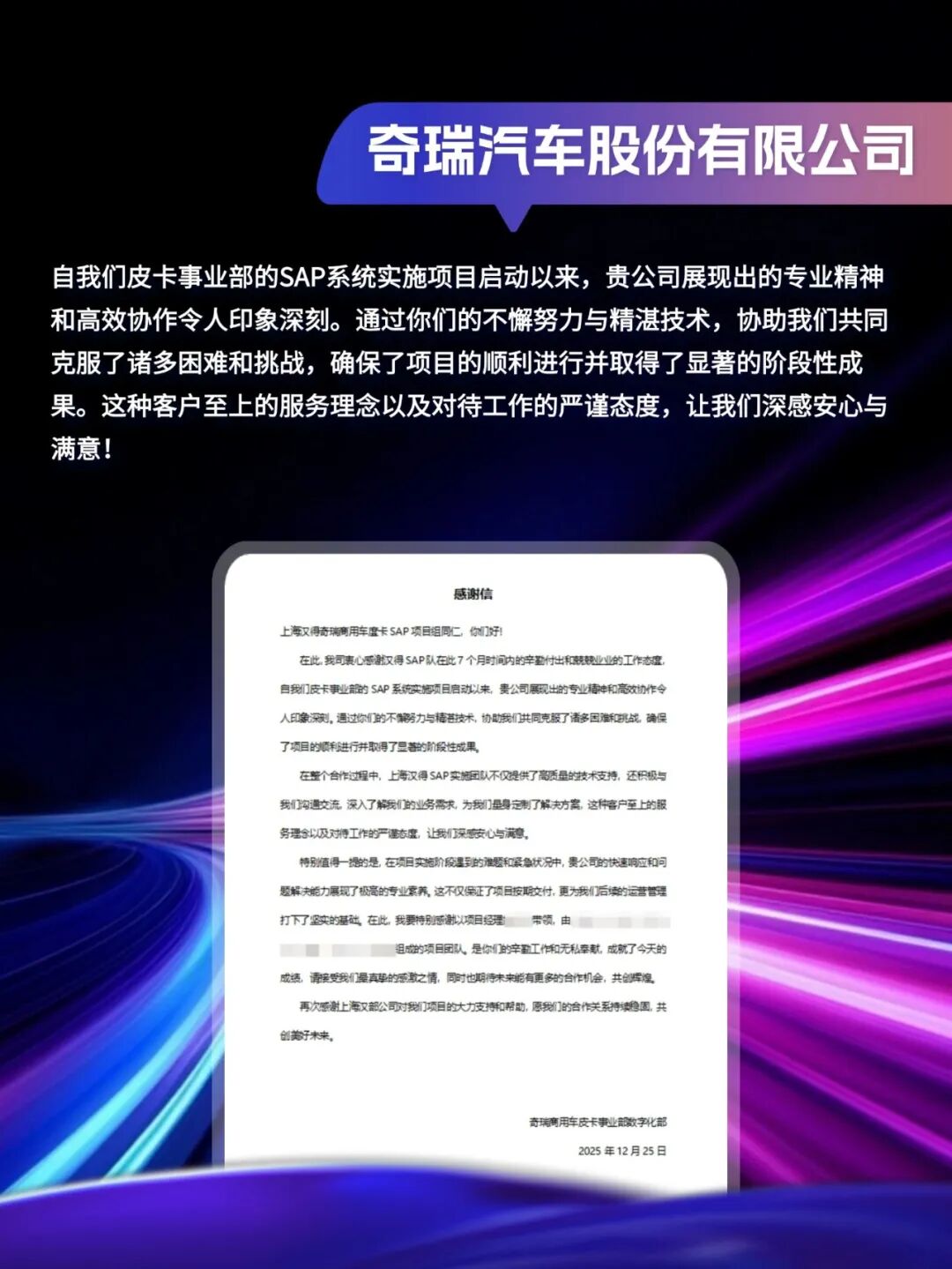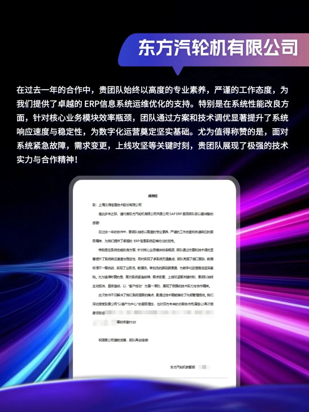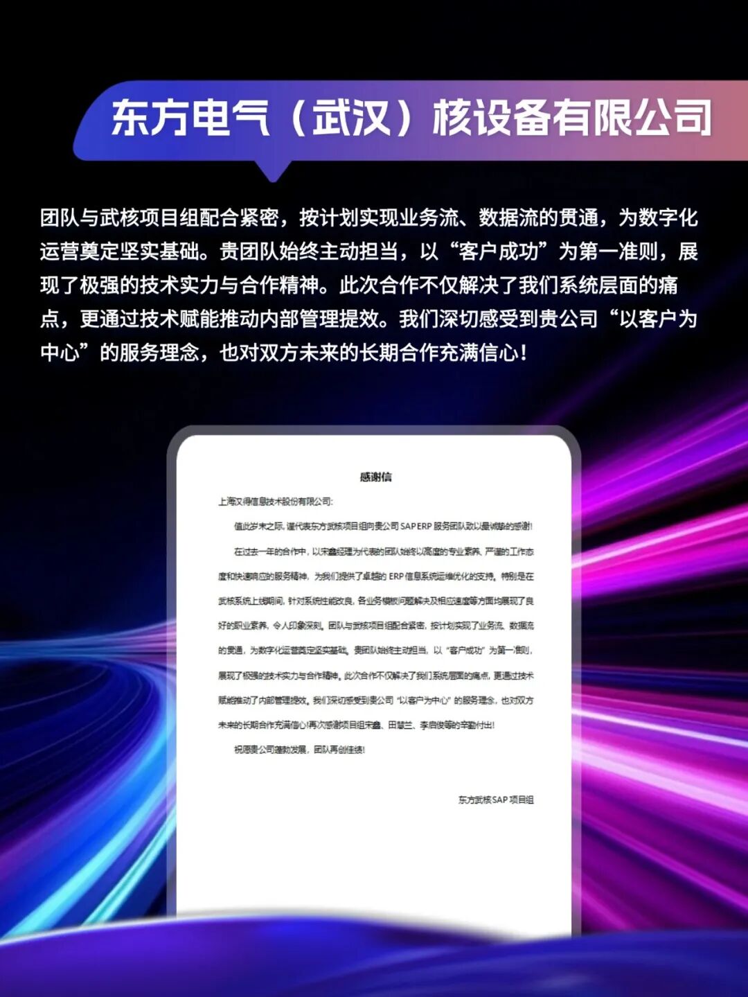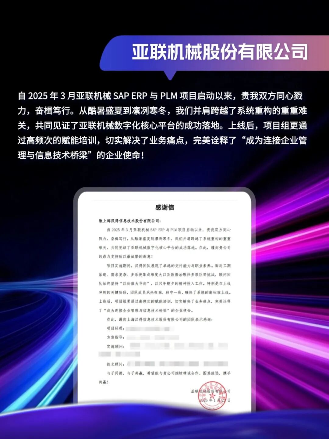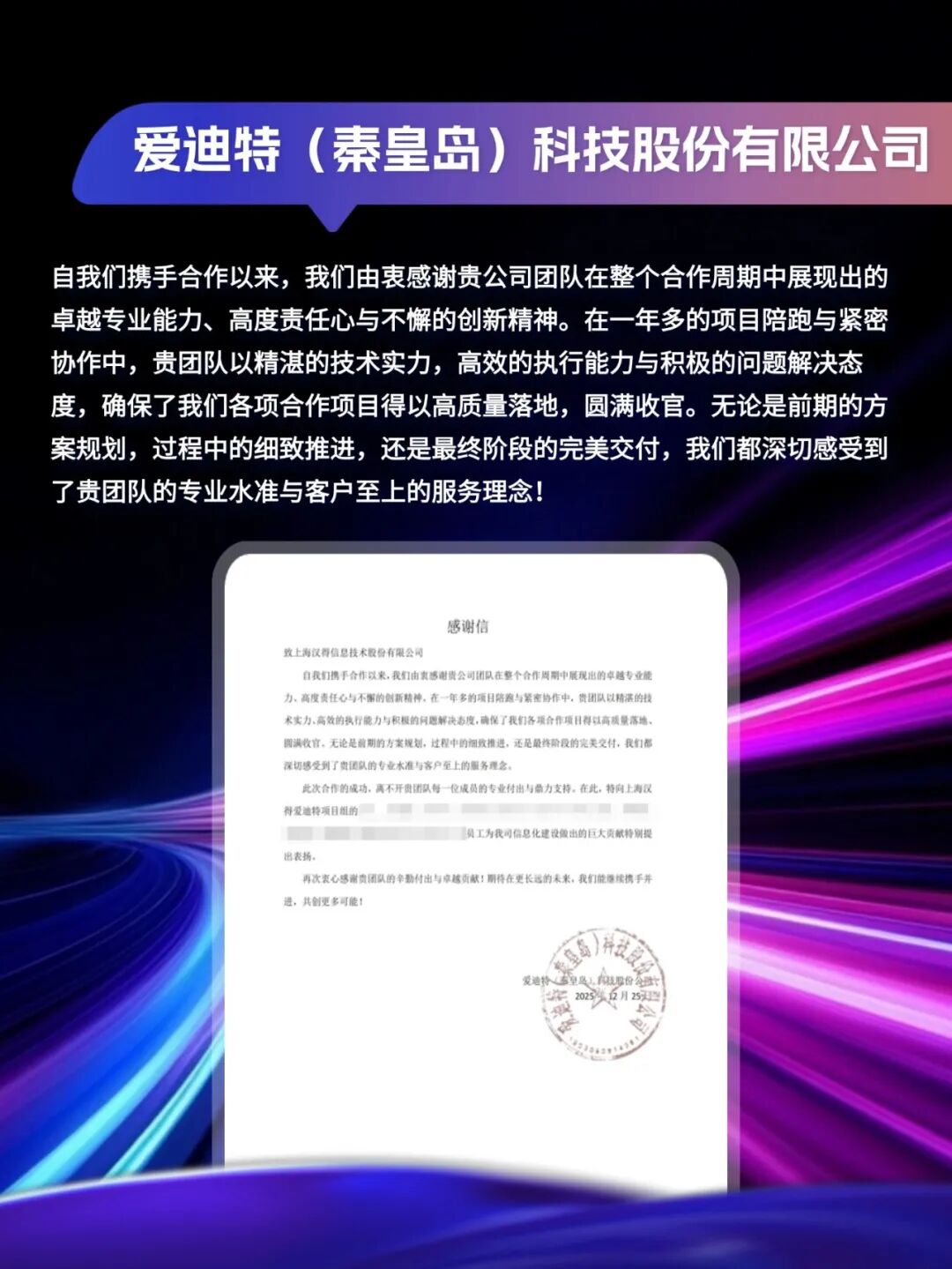 同心致远,智筑华章,一路相伴,感恩同行。在产业数字化与智能化的征程上,汉得始终与客户并肩同行,以数智为犁深耕价值,以初心为炬照亮前路,携手跨越每一次挑战,共赴每一场成长。从方案落地到效能跃升,从携手攻坚到共创共赢,每一段并肩前行的时光,都凝结着双向奔赴的信任与默契。以下收录了部分客户感谢信一封封真挚的感谢信,是字里行间的温暖认可,是岁月沉淀的专业肯定,更是我们深耕数智领域的底气与荣光。感谢每一位携手同行的客户伙伴,一路信任托付,并肩耕耘相伴。我们将继续以专业为笔,以初心为墨,与客户伙伴同心深耕数智沃土,并肩奔赴更璀璨的未来。携手汉得,共铸硬核竞争力!