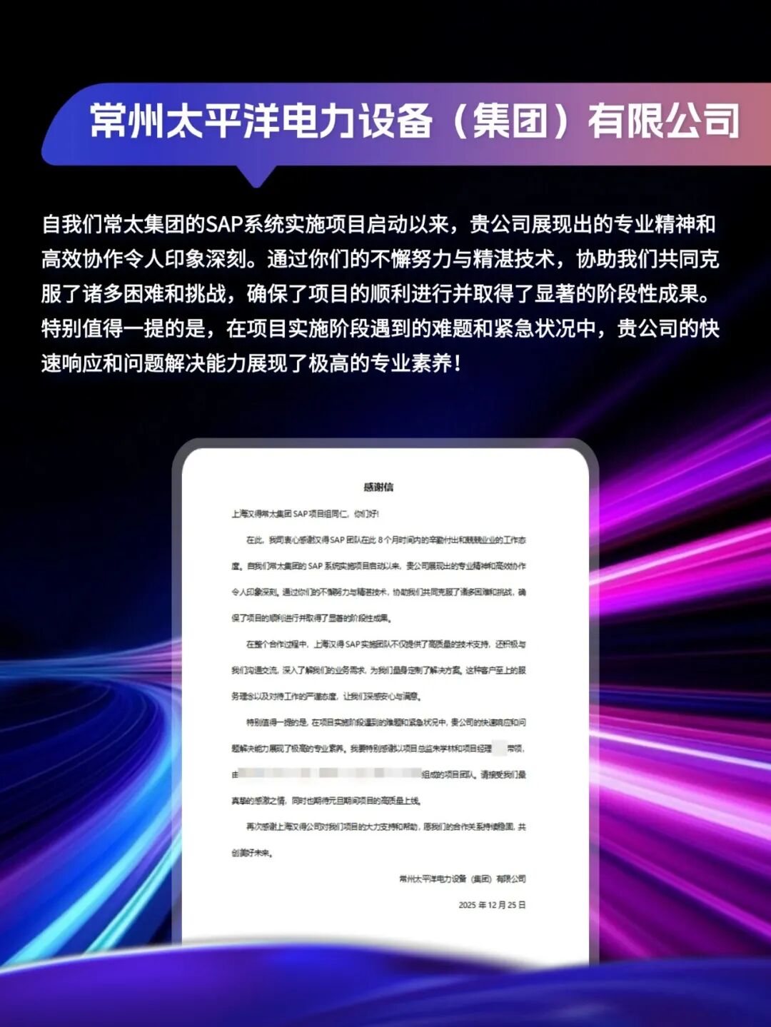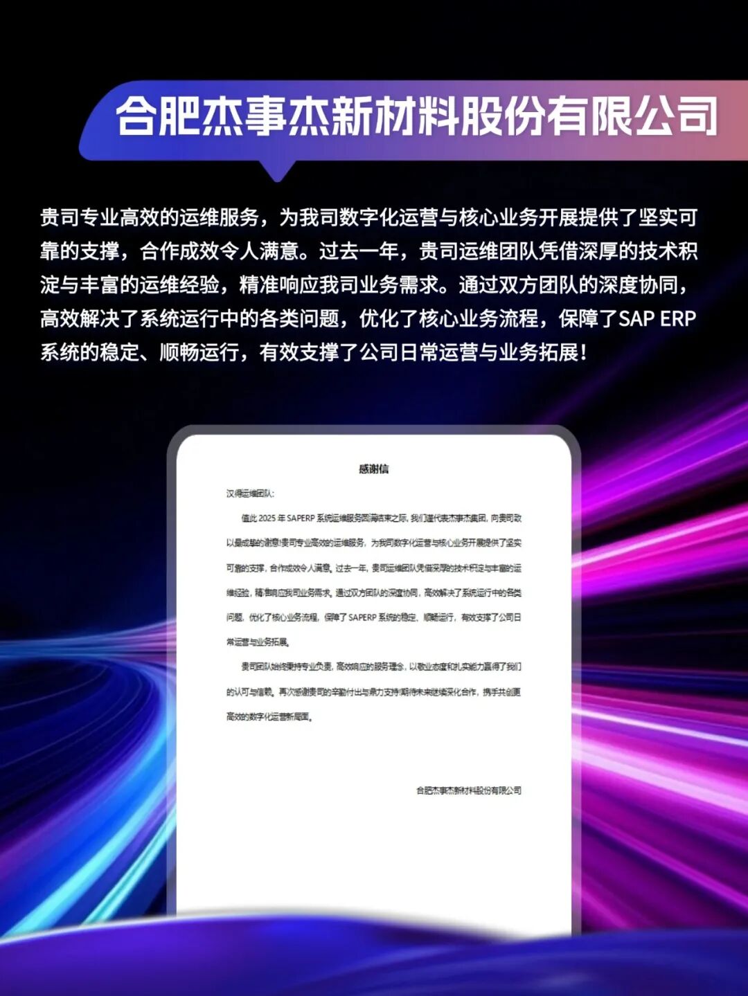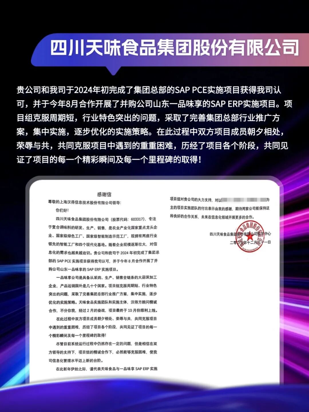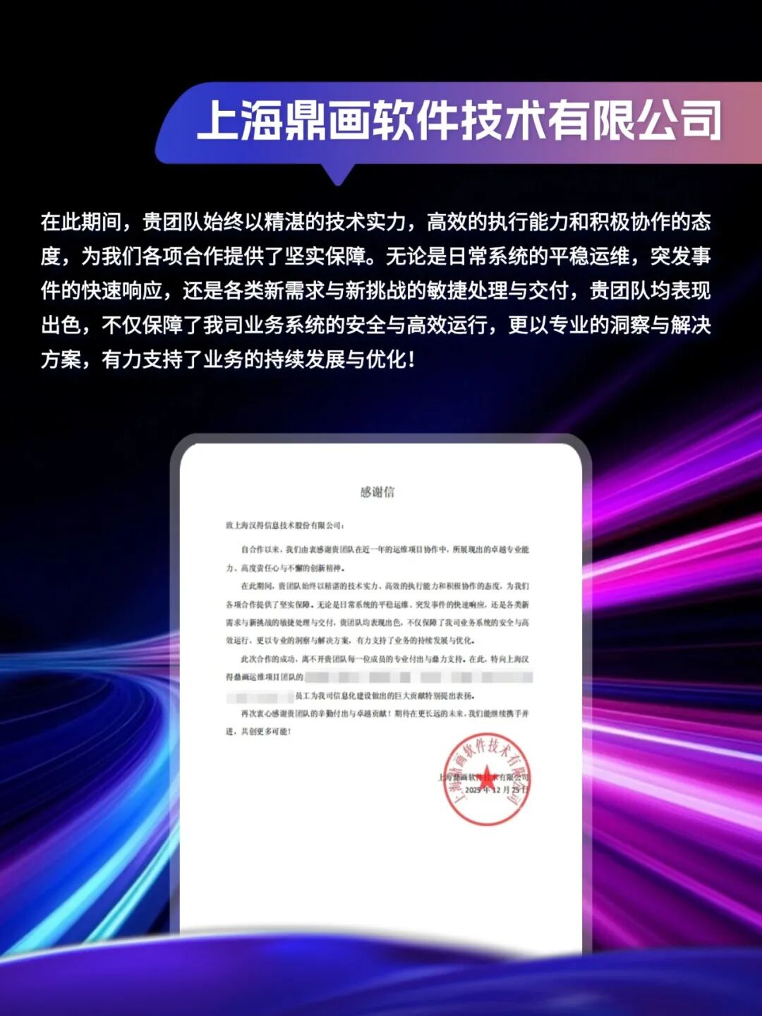 同心致远,智筑华章,一路相伴,感恩同行。在产业数字化与智能化的征程上,汉得始终与客户并肩同行,以数智为犁深耕价值,以初心为炬照亮前路,携手跨越每一次挑战,共赴每一场成长。从方案落地到效能跃升,从携手攻坚到共创共赢,每一段并肩前行的时光,都凝结着双向奔赴的信任与默契。以下收录了部分客户感谢信一封封真挚的感谢信,是字里行间的温暖认可,是岁月沉淀的专业肯定,更是我们深耕数智领域的底气与荣光。感谢每一位携手同行的客户伙伴,一路信任托付,并肩耕耘相伴。我们将继续以专业为笔,以初心为墨,与客户伙伴同心深耕数智沃土,并肩奔赴更璀璨的未来。携手汉得,共铸硬核竞争力!