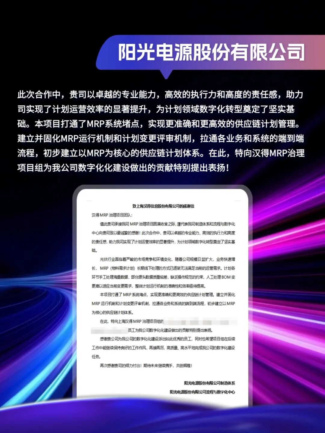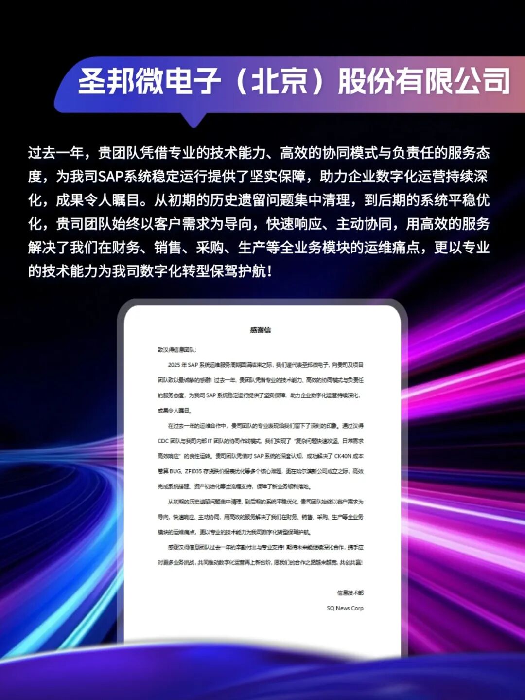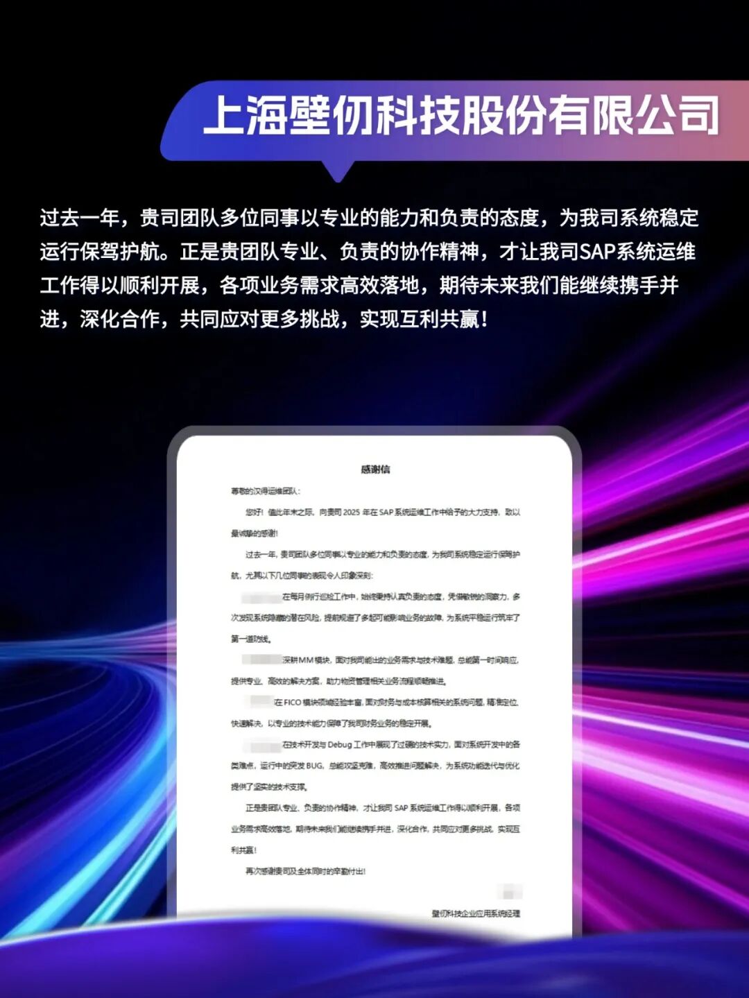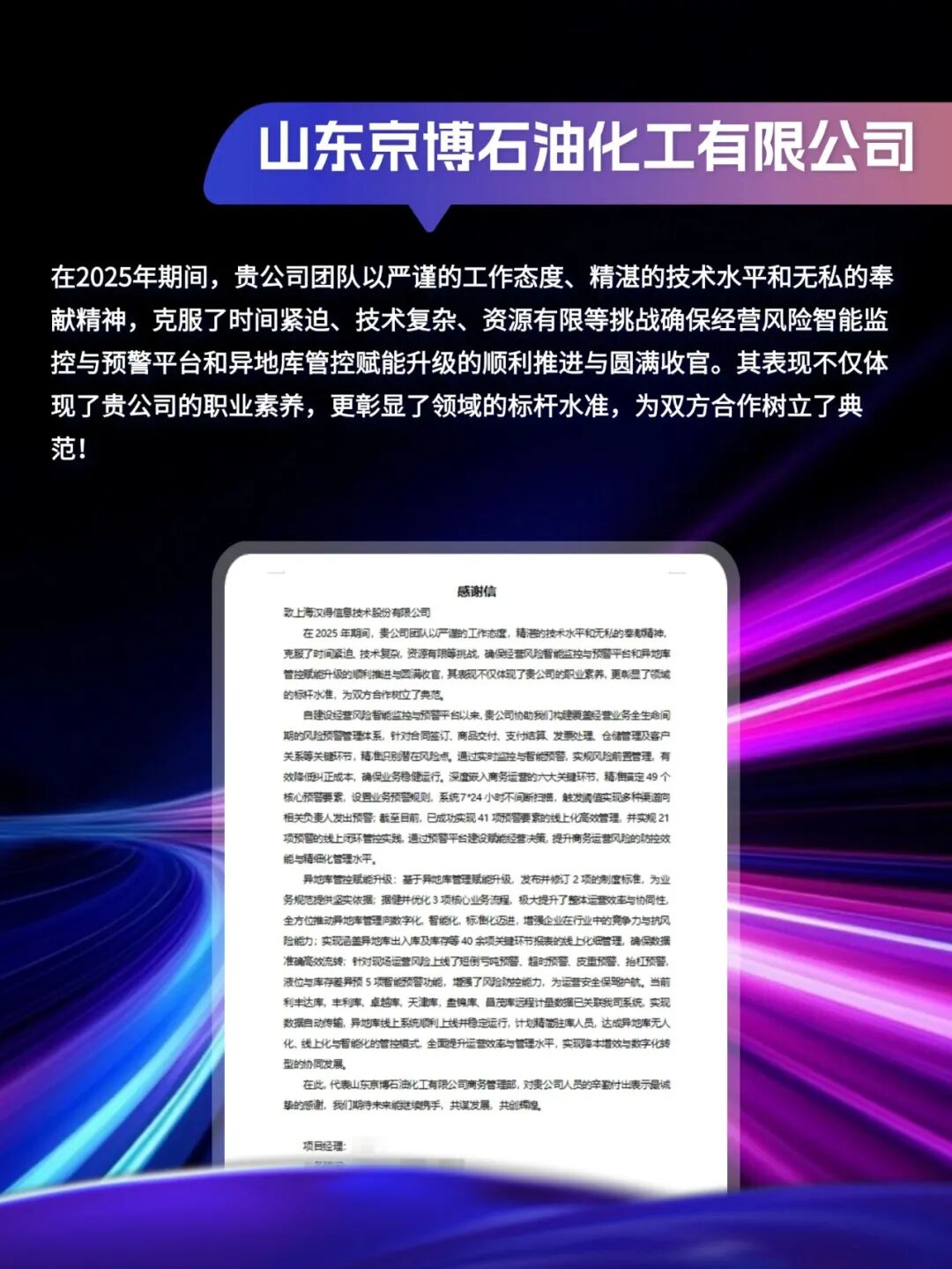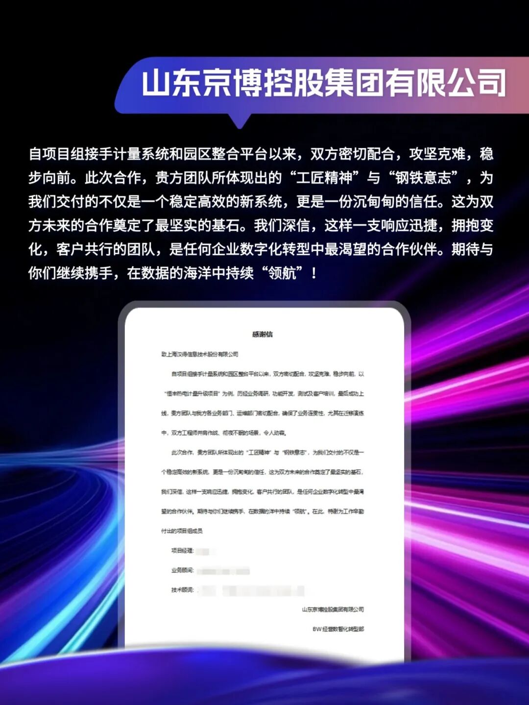 同心致远,智筑华章,一路相伴,感恩同行。在产业数字化与智能化的征程上,汉得始终与客户并肩同行,以数智为犁深耕价值,以初心为炬照亮前路,携手跨越每一次挑战,共赴每一场成长。从方案落地到效能跃升,从携手攻坚到共创共赢,每一段并肩前行的时光,都凝结着双向奔赴的信任与默契。以下收录了部分客户感谢信一封封真挚的感谢信,是字里行间的温暖认可,是岁月沉淀的专业肯定,更是我们深耕数智领域的底气与荣光。感谢每一位携手同行的客户伙伴,一路信任托付,并肩耕耘相伴。我们将继续以专业为笔,以初心为墨,与客户伙伴同心深耕数智沃土,并肩奔赴更璀璨的未来。携手汉得,共铸硬核竞争力!