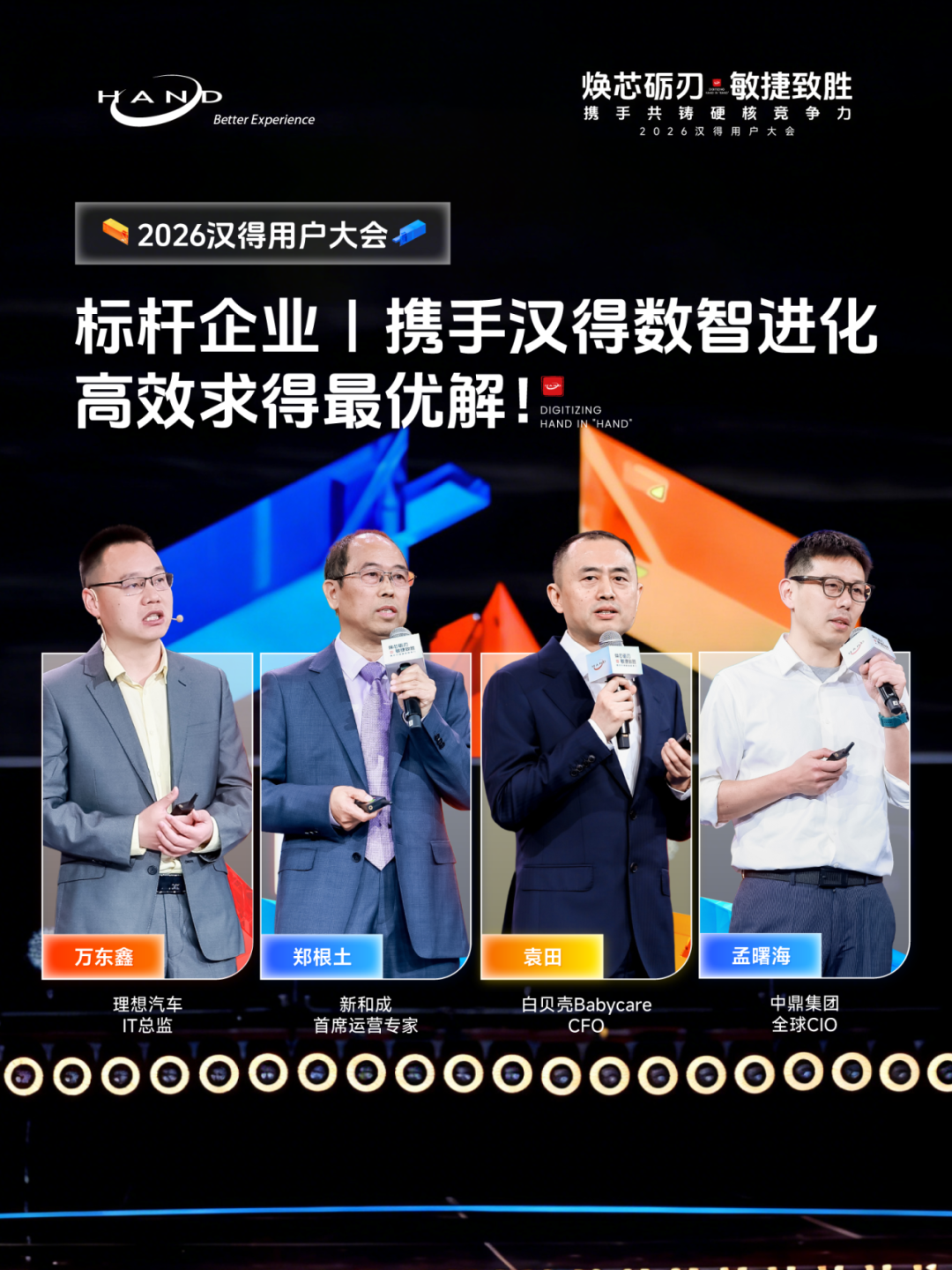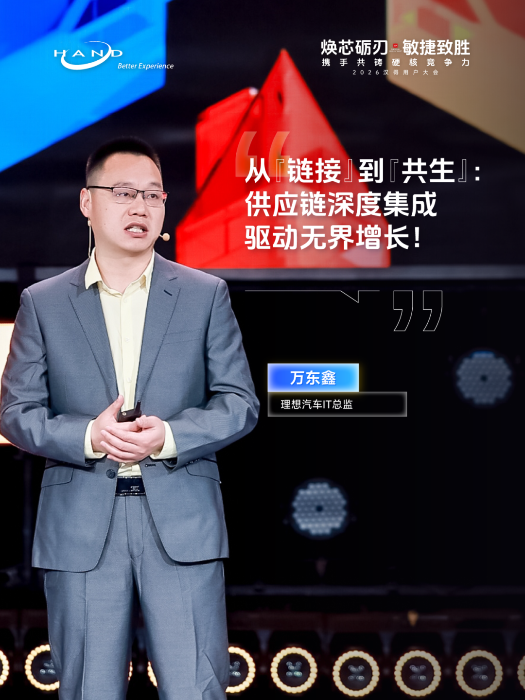 2026汉得用户大会,特邀理想汽车、新和成、白贝壳Babycare、中鼎集团等标杆企业,结合一线实践,分享在汉得的助力下,如何通过 AI 技术,深度融入企业供应链集成、智慧架构重塑、全渠道业财智能中枢建设,以及全球化智能制造等核心领域的实践经验与落地成效。 理想汽车供应链深度集成 共筑零冗余敏捷交付 理想汽车 IT 总监万东鑫发表题为《理想汽车供应链深度集成,共筑零冗余敏捷交付》主题演讲。在数字化浪潮与市场环境瞬息万变的背景下,企业竞争已演变为供应链生态系统的较量。面对传统供应链的信息孤岛与响应迟缓,“供应链深度集成”应运而生。 通过打通上下游数据壁垒,融合 AI 与大数据,深度集成实现从交付到质量的端到端全链路协同。这赋予了供应链前所未有的敏捷性与韧性,帮助企业在不确定性中精准预测需求、优化资源配置、提升产品质量。 万东鑫指出,新能源汽车行业竞争已进入下半场,渗透率超 50%,竞争焦点从产品力转向供应链韧性与交付能力,而理想此前面临信息不对称、风险滞后、成本库存压力大、数据价值低四大供应链痛点,这成为与汉得共建深度集成平台的核心动因。 双方聚焦供应计划、质量管理两大领域,确立计划同频、风险预警、数据共享等四大目标,理想汽车与汉得联合打造包含“一个平台、3 套模型、17 类应用场景、22 类数据对象”的三层架构——供应商深度集成平台。 平台整合供应商多维度核心数据,形成供应链数据湖,研发三大核心模型,构建起供应商质量黑盒透明和供应商交付卫士三道防线两大核心能力,实现质量问题事前防控、供应链全链路风险前置识别,推动供应链管理从事后 “救火” 转向事前 “防火”。 平台落地采用试点先行、逐步推广策略,目前已完成 62 家核心供应商互联,覆盖理想汽车超 80% 采购支出;通过三方高层联动推进,还沉淀了行业数据标准与操盘手册,降低互联成本。 落地后成效显著,产业链计划准确率、人员运营效率均提升 10% 以上,库存及停线索赔损失减少上亿元,来料 PPM 降低 5 个百分点;更成功拦截问题零件、提前 168 小时预警缺料危机,问题协同闭环效率提升 10 倍。 对于理想供应链数智化的未来两大规划,万东鑫介绍道:一是全球化布局,分三阶段推进,目前正与汉得联合实施海外 ERP,后续将拓展海外生产供应体系,打造全球供应网络;二是全链路 AI 赋能,当前已在文档审核、零部件检测、风险预警等场景落地 AI 应用,未来将研发工业垂域大模型,基于产业链数据与场景训练模型,与供应商联合创新,实现供应链端到端 AI 提效。 理想汽车与汉得的深度合作,不仅打造了适配新能源汽车行业的供应链深度集成平台,更探索出可复制、可推广的供应链数智化转型路径,为行业构筑供应链竞争壁垒提供实践参考! 知识重塑,Agent 共生 定义新和成下一代企业智慧架构 新和成首席运营专家郑根土发表题为《知识重塑,Agent 共生:定义新和成下一代企业智慧架构》主题演讲,结合新和成作为精细化工企业的行业特点与数字化转型实践,分享企业从 AI 探索到与汉得深度合作落地应用的全过程。 郑根土介绍道,新和成早在 2024 年年中便从战略层面布局 AI,2025 年初完成行业调研后,因理念契合、文化同频,选择与务实且深耕企业数字化的汉得达成合作,双方于 2025 年 9 月启动 AI 项目,仅半年便完成一期建设工作。 针对精细化工行业的特性,郑根土创新提出 AI 应用的双环理论,并强调 AI 是优化器而非控制器,化工企业的生产核心仍需依托专业自动化控制,AI 的价值在于通过数据挖掘为生产运营提供决策支撑,双环协同才能实现企业高效、安全运营。 郑根土表示,选择汉得作为合作方,核心源于双方价值观高度契合、行业理解深度匹配:汉得深耕企业数字化领域,熟悉化工企业痛点,其自主研发的企业级 AI 平台与新和成现有数字化架构高度适配;且汉得务实的合作态度、开放的生态文化,让双方从初步交流便形成高度信任。 同时他指出,化工行业具有极强的专业性,通用型 AI 方案易出现“水土不服”,而汉得能深入行业、理解业务,为企业 AI 落地提供专业支撑,这也是双方合作顺利推进的关键。 在 AI 落地实践中,新和成秉持场景为王的原则,从业务价值与技术可行性双维度筛选应用场景,优先落地基础性、高价值、高可行性的明星场景,快速培养企业内部 AI 文化; 同时重视平台搭建与数据治理,认为企业级 AI 落地离不开专属平台支撑,唯有打破数据壁垒、做好数据治理,才能让 AI 真正发挥价值。 目前,双方已完成一期平台搭建,在制度查询、多语言翻译、价格管理、采购销售等环节实现 AI 初步应用,并成立专门 AI 团队提供组织保障,已具备可控公网接入、多场景 AI 工具应用等能力。 面向未来,郑根土表示,新和成将与汉得持续深化合作,打造以知识与智能体为核心的新一代 AI 应用架构系统,将工厂运营划分为智能运营和智慧管理两大板块,从应用、业务、系统、数据架构全维度打造企业 AI 体系。 他强调,AI 并非万能,但选对场景、做好平台与数据治理,便能成为企业数字化转型的放大器。新和成希望在汉得的持续助力下,搭建专属的 AI 应用体系,实现研产供销服智能体矩阵构建,打造化工行业下一代企业智慧架构,力争成为精细化工行业 AI 应用的标杆企业! Babycare 极致 DTC 模式下 全渠道业财智能中枢构