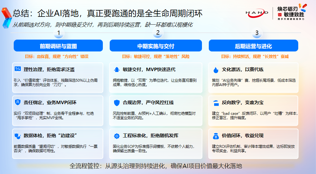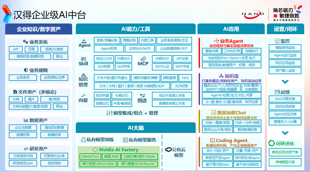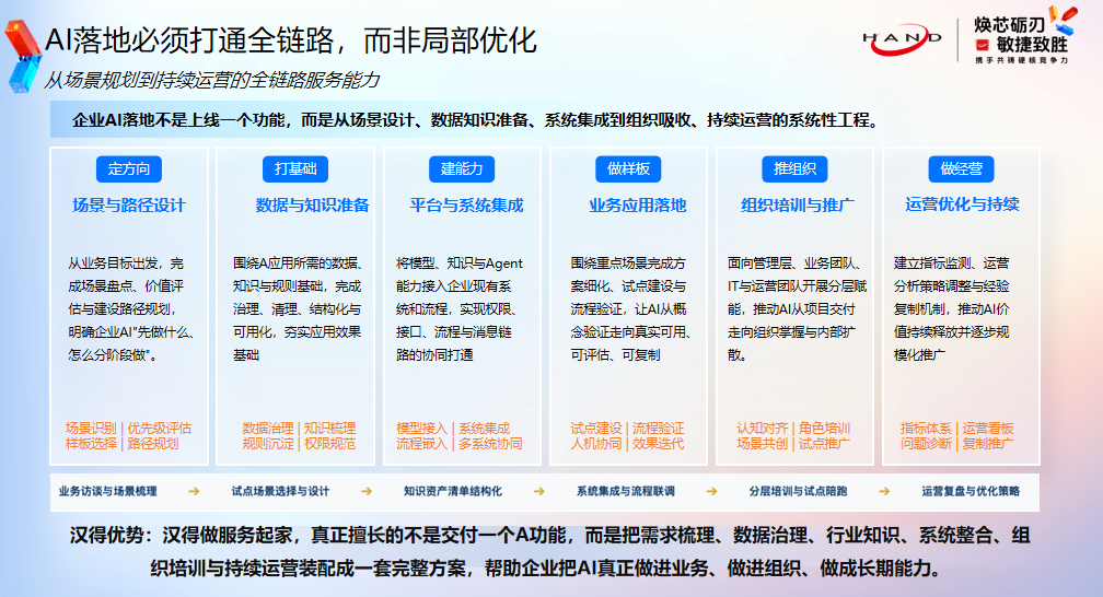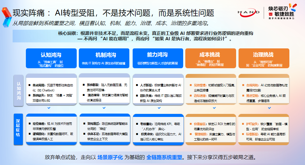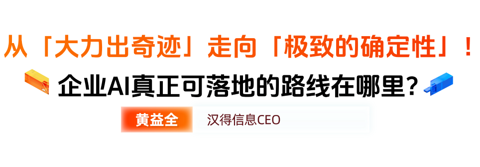 随着大模型技术的不断演进,企业级AI应用正跨越“概念验证”阶段,全面迈入实质性的“价值落地”深水区。 从行业实践来看,企业的关注点正在发生深刻转变:从最初惊艳于“AI能做什么”,转向拷问“AI能否稳定融入业务,并持续创造真金白银的价值”。如何打破系统孤岛、消除数据越权隐患、避免高投入的AI沦为无法规模化的“点状工具”? 在“2026汉得用户大会”现场,多位来自制造业与科技领域的数字化先锋,围绕真实落地路径,分享了从场景选择、组织推进到体系建设的硬核经验。我们为您深度提炼了本次大会的核心洞察与实战干货,邀您共探AI时代的数智跃迁之路。 以下内容按大会现场议程顺序展开,依次梳理各位嘉宾的核心观点与实践分享。 ○ “企业AI真正需要的,不是‘大力出奇迹’,而是在业务边界内实现更稳定、更可控、更具投入产出比的确定性。” 面对AI带来的新一轮产业变革,企业一边充满期待,一边也在经历更现实的分化与重估。在分会场开场致辞中,汉得信息CEO黄益全指出,过去一年,企业对AI的热情前所未有,但真正进入实践后,越来越多企业开始意识到:ToC端的惊艳体验,并不等于ToB端可以直接复制的落地路径。对企业而言,AI不是“用了就会立刻上天入地”,而是必须回到成本、约束、准确率和业务价值这些更现实的问题上来。 黄益全提出,相比“大力出奇迹”的个人AI逻辑,企业真正需要的,是“极致的确定性”。所谓极致的确定性,一方面是以更小代价获得更稳定结果,另一方面是围绕企业真实业务,把与场景无关的能力、信息和自由发挥尽可能收敛掉,让AI更聚焦、更可控、更贴近业务本身。企业不是追求无限算力和无限参数,而是要让AI在明确边界内,稳定解决具体问题。 围绕这一路线,黄益全进一步总结了企业AI落地的两个关键抓手:一是持续沉淀原子能力,把查库存、查订单、查可用量等确定规则、确定流程的事情,通过API、工具、程序、SaaS应用等方式固化下来,减少不必要的模型消耗;二是打通数据、构建本体,让订单、库存、单据等分散数据真正串联起来,形成围绕业务对象的充分信息,为AI判断与执行提供更强支撑。相比简单做Mapping,企业更需要的是围绕本体持续展开数据,让数据真正服务于确定性的形成。 黄益全表示,企业AI最终拼的,不只是模型能力本身,而是数据、原子能力与场景分工设计的长期积累。依托H-ZERO、H-ONE及AI中台相关能力,结合对行业场景的持续理解与沉淀,汉得正帮助企业找到属于自己的AI落地路线。只有真正把AI放进场景、放进分工、放进业务约束中,企业才能从焦虑与观望中走出来,稳步迈向属于自己的智能化新阶段。 ○ “不盲目追逐技术热潮,坚持‘先精益,后AI’,用业务价值牵引技术落地。” 作为全球精密传动领域的重要企业,深耕齿轮制造45年的双环传动,正以一条务实、稳健的AI转型路径,成为制造业智能化升级的代表案例。 分享中,双环传动系统介绍了围绕“环抱AI”战略展开的整体布局:一方面,企业搭建GPU集群,私有部署DeepSeek、Qwen等大模型,并联合汉得信息灵猿AI中台构建“1+2+3+N”技术架构;另一方面,在组织侧由高层牵头成立AI工作组,培养100名内部智能体开发者,推动AI从技术探索走向业务协同。 聚焦研、产、供、销、质等核心环节,双环已打造30多个核心智能体和100多个轻量特色智能体,并取得一系列清晰成果:质量AI助手让问题解决效率提升30%;合同评审智能体每年覆盖1.7万份合同;销售订单智能体年节约6912小时;齿轮外观缺陷识别检出率达到99.8%。 更值得关注的是,双环传动始终坚持“先精益、后AI”的理念,以“场景—价值—技术”为主线,从小切口切入、先验证ROI、再批量复制,推动AI从重复任务自动化逐步走向经营决策优化,不仅助力双环向 “全球齿轮制造第一” 的目标稳步迈进,也为制造企业AI落地提供了极具参考价值的实践样本。 ○ “企业AI建设的关键,不在于零散试点,而在于把智能体、知识、架构与治理能力沉淀为可复制的系统能力。” 当AI从技术试验走向产业主战场,企业关注的重点,正在从“能不能用”转向“如何规模化创造价值”。在分会场分享中,汉得信息AI事业部总经理何楠指出,今天企业推进AI,难点早已不只是模型和工具本身,而是如何跨越场景选择、知识准备、系统协同、组织机制与治理运营等多重门槛,把零散尝试沉淀为可复制、可持续的系统能力。汉得也观察到,未来3—5年,企业AI建设将进一步走向多智能体协同、AI工厂、物理AI与智能治理并行演进的新阶段。 基于过去一年大量项目实践,何楠提出,企业AI落地既不能停留在价值有限的局部试点,也不能一开始就追求大而全,而应优先聚焦高频发生、规则可沉淀、结果可量化的关键场景,从试点验证走向持续复制。 他特别强调,AI竞争力的关键,已经不仅是“有没有智能体”,而是谁能更快、更准地把成熟可用的智能体落进业务流程、落进组织体系,真正形成规模化落地效率。 在分享中,何楠还进一步谈到,AI时代企业真正要重构的,不只是应用层能力,更是面向智能体协同的业务架构、面向知识沉淀的数据架构、面向跨系统调度的应用架构,以及面向AI工厂持续演进的技术架构。与此同时,业务智能体交付、模算协同、知识工程、AI治理等新能力,也正在成为企业迈向AI原生组织必须补齐的关键基础。 依托