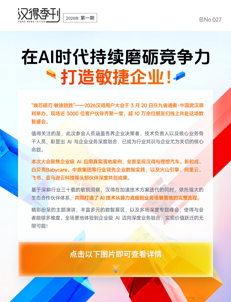 #01焕芯砺刃 · 敏捷致胜2026汉得用户大会点击图片,查看详情汉得加速技术方案迭代,依托生态伙伴体系,打通AI从算力底座到业务场景落地完整流程理想汽车、新和成、白贝壳Babycare、中鼎集团,分享扎实落地的实践经验与落地成效火山引擎、阿里云、飞书、亚马逊云科技,深入探讨如何携手汉得以AI重塑企业级应用范式#02场景落地深耕业务融合 携手数智进化点击图片,查看详情汉得与中亿丰联合申报《建筑行业项目智慧运营与风险预警中枢》项目获“全国人工智能应用场景典型案例”海亮股份携手汉得打造的「财务智能审核项目」在与众多五百强同台竞技中,荣获第三名佳绩,AI智能审核硬核实力见证汉得与罗欣药业达成深度合作,将先进的AI技术与业务场景深度融合,为客户创造落地价值精细化工龙头新和成、电力装备领军企业思源电气,在运营全流程赋能与全球竞标标书智能解读两大关键场景完成标杆上线助力深圳瑞捷构建项目全生命周期管理体系,围绕LTC主线与“四算一体”,提升项目经营可视可控与决策支撑能力汉得联合易立德,以ETRX数智平台为核心引擎,正式开启奔达研发数智化升级新征程始终以专业能力回应不同行业领域核心诉求,以数字化筑牢产业根基,用AI释放增长潜能与客户并肩同行,以数智为犁深耕价值,以初心为炬照亮前路,携手跨越每一次挑战聚焦行业场景,打通数智链路,与客户伙伴们携手走过从方案落地到价值增长的每一段旅程我们感受到企业家及管理者,对数字化驱动业务价值诉求越来越迫切,焦虑和期望更为明显#03年度案例沉淀标杆经验 见证效率升级点击图片,查看详情汉得年度精选案例|我们也将加倍努力,以更清晰的理念、更完善的产品、更高质的服务帮助企业实现目标汉得AI数智化故事|看似小步的探索创新与落地成果背后,是一段段极具价值的数字化故事汉得H-ONE融合数据平台与您并肩同行,共同见证数据价值在每一个业务决策中生根发芽#04深耕自研守正创新笃行 硬核实力筑基点击图片,查看详情汉得AI-CAMP向上灵活接入各类AI生产力,向下赋能业务,成为企业AI能力“总控中心”汉得H-AI Coder飞码大模型,精准匹配企业级软件开发需求,为软件开发注入强劲动力汉得企业级智能编码助手,提供更加规范、高效的开发体验,提升用户开发效率与代码质量汉得猪齿鱼V3.0,提供从“开箱即用”到“深度定制”的完整智能协作解决方案汉得EI-SCM + AI,把AI从“聊天工具”升级为“供应链执行引擎”,真正构建企业级的供应链智能执行能力汉得穿透式监管全套数智化解决方案,助力企业实现从“人防”向“技防”、从“模糊”向“精准”的监管范式飞跃汉得贸易合规解决方案围绕跨境经营场景,构建多层风险识别机制,让风险止步于系统预警#05载誉前行三十而立 只争朝夕点击图片,查看详情这份肯定是对汉得深耕制造业数字化转型、推动AI与工业场景深度融合实践成果的高度认可汉得以“场景驱动智能”的实干理念,与各企业携手,书写属于中国企业数智进化的时代答卷