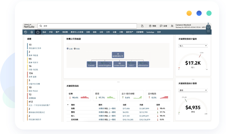 跨地理区域、币种和税务管辖区获得从企业到子公司到各个项目的全面实时可见性,并通过集成的财务流程、资源优化和服务管理满足全球业务需求