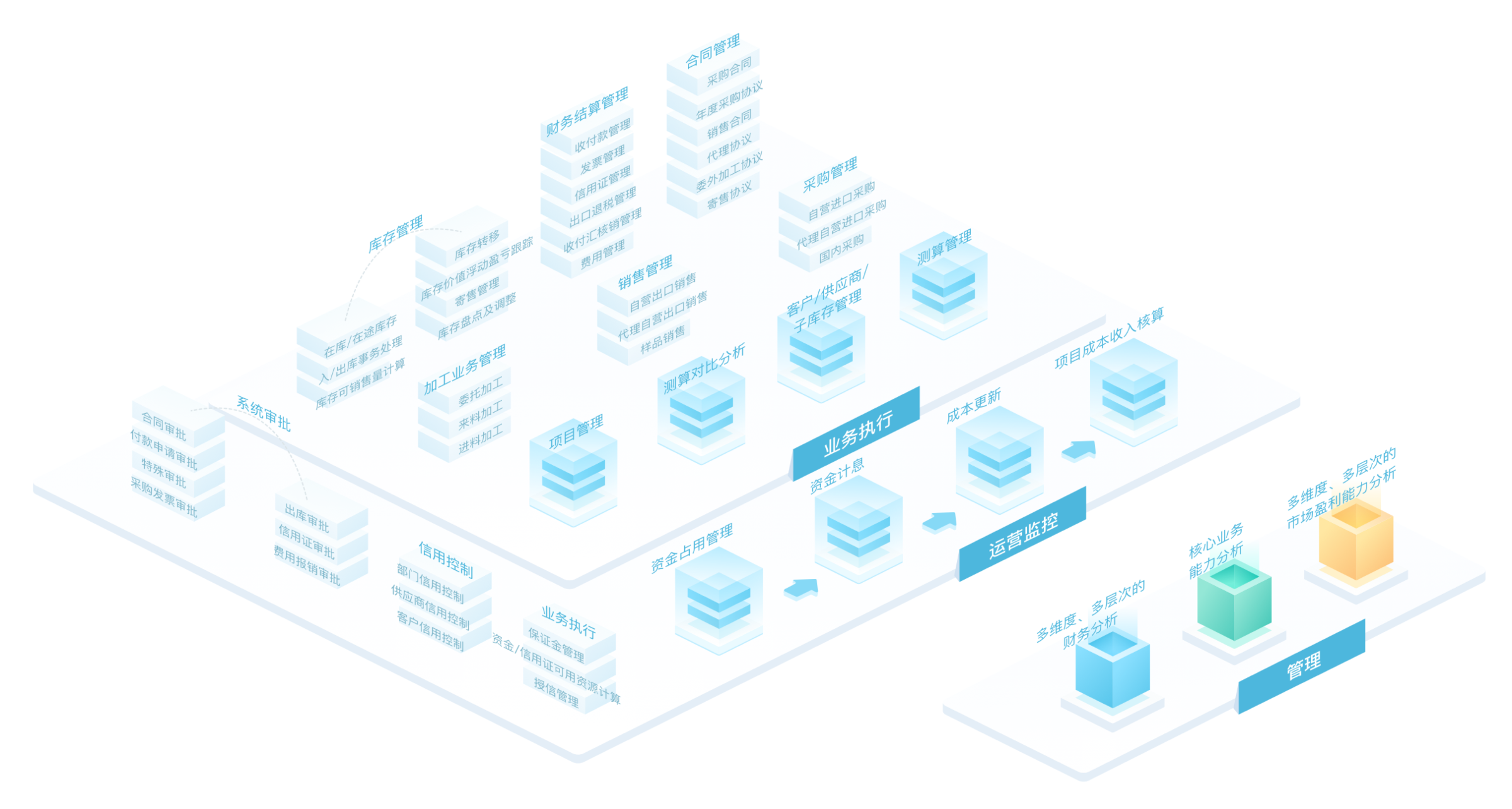 在市场波动剧烈、竞争加剧的环境下,传统贸易企业必须看到世界经济秩序已经发生了重大变化,在科技进步的带动下,经济全球化的进程逐渐加快,成为世界经济发展的主流。在全球化的市场条件下,贸易流通企业已经有了革命性的变化,从传统的买卖中间商,逐渐转变成为了供应链的组织管理和服务商。在行业发展趋势下,贸易企业数字化解决方案应当包含以下几个方面:以合同履约为核心跨业务、物流、财务的高效协作、高效的合同执行状态跟踪;灵活支持各种贸易业务模式和业务管控要求;全局的库存状态跟踪以及高效的物流业务管理;以信用、库存、资金为核心的风险管控体系;准确的业务全成本核算,灵活适应不同的内部绩效考核要求;全面的资金管理体系;大宗商品的期货管理